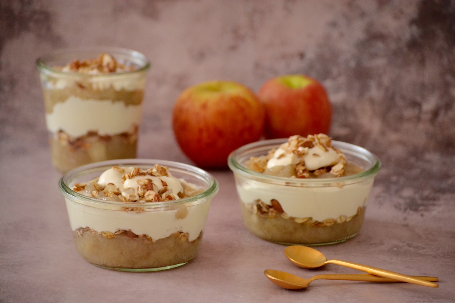 - Kom skiftevis æblegrød, crunch og flødeskum i de ønskede skåle