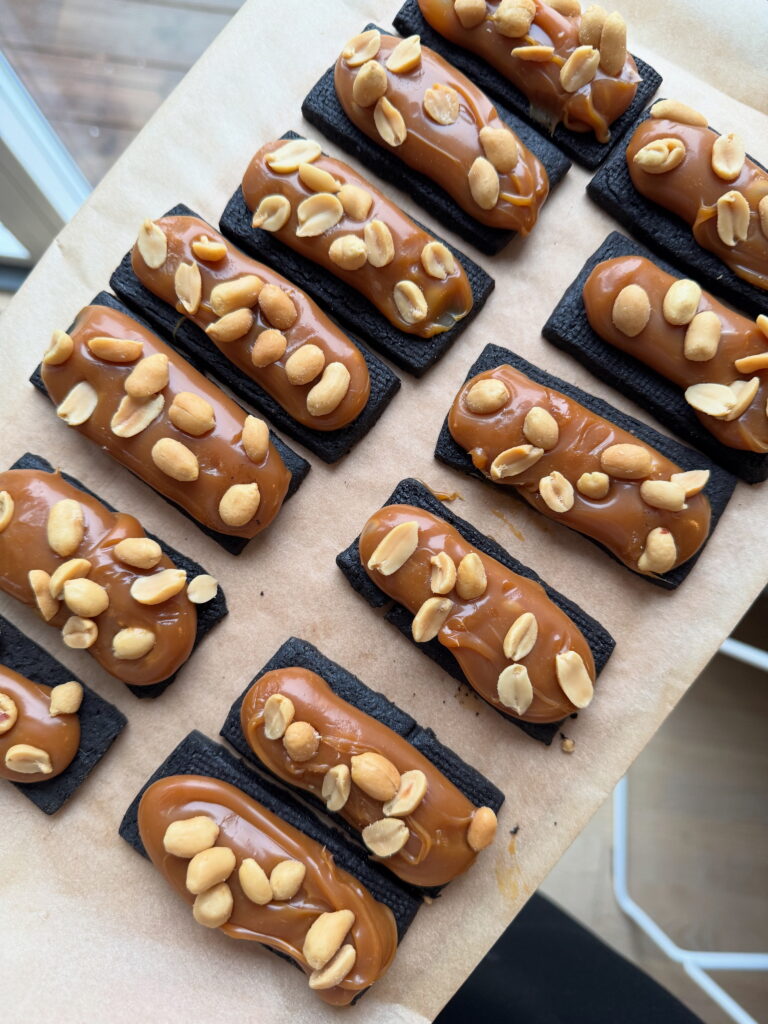 - Sprøjt en stribe karamel og drys med peanuts på karamellen